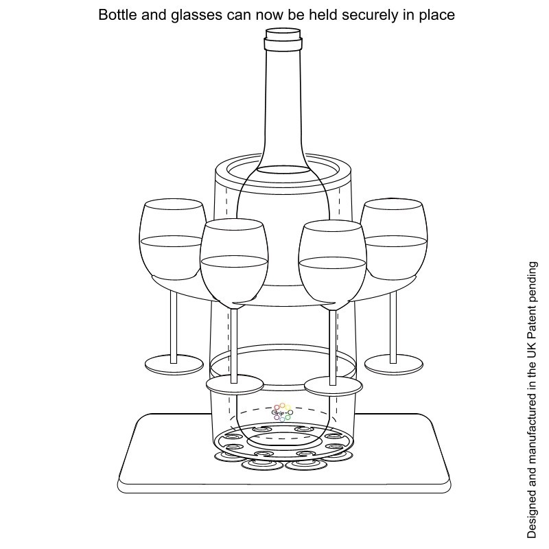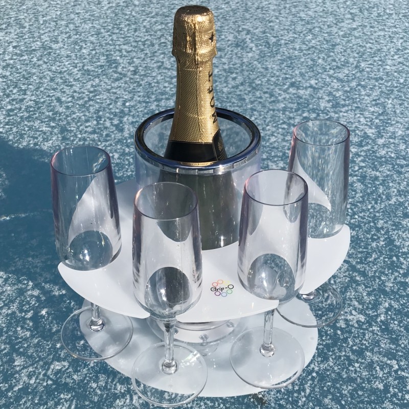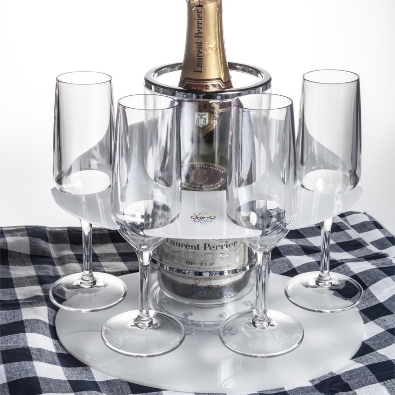 The Grip-O is a large acrylic bottle holder with 8 suction feet designed to stick to smooth surfaces such as fibreglass gelcoat, hot tubs, plexiglass, glass, metal or any smooth non-porous surface. The Grip-O Picnic Party Bar is supplied with 4 champagne or 4 wine glasses, or 4 Hi-ball glasses, 4 glass Party Tray and a Perfect Picnic Tray